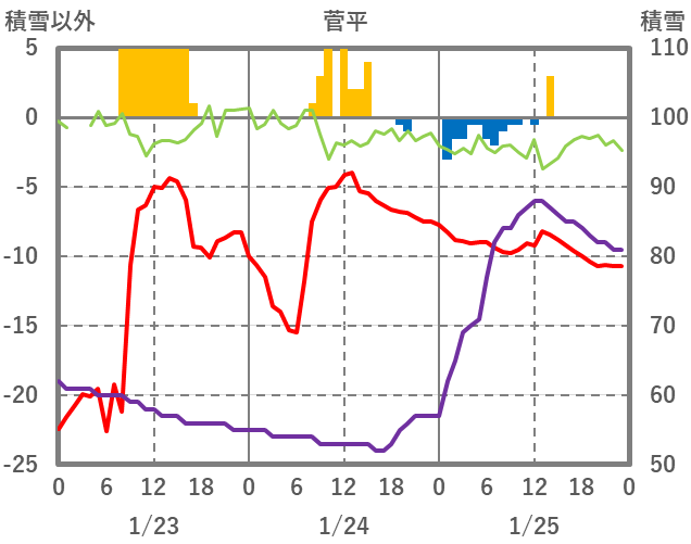 | 日 | 時 | 気温 | 降水 | 風向/風速 | 日照 | 積雪 | 降雪 |