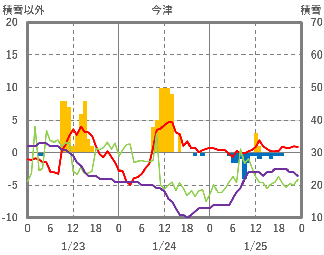 | 日 | 時 | 気温 | 降水 | 風向/風速 | 日照 | 積雪 | 降雪 |