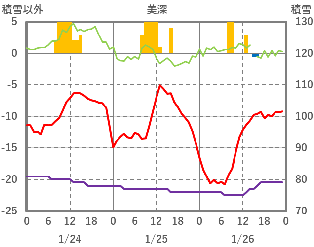 | 日 | 時 | 気温 | 降水 | 風向/風速 | 日照 | 積雪 | 降雪 |