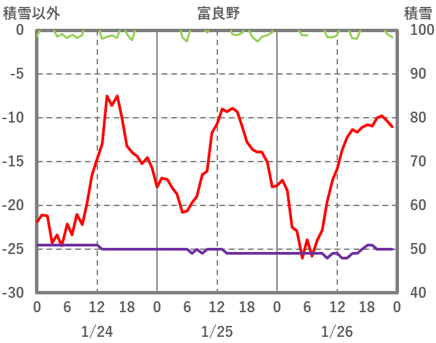 | 日 | 時 | 気温 | 降水 | 風向/風速 | 日照 | 積雪 | 降雪 |