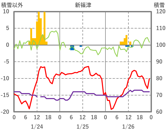 | 日 | 時 | 気温 | 降水 | 風向/風速 | 日照 | 積雪 | 降雪 |