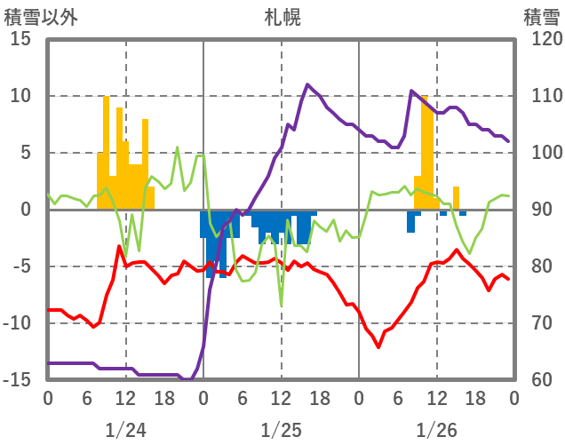 | 日 | 時 | 気温 | 降水 | 風向/風速 | 日照 | 積雪 | 降雪 |