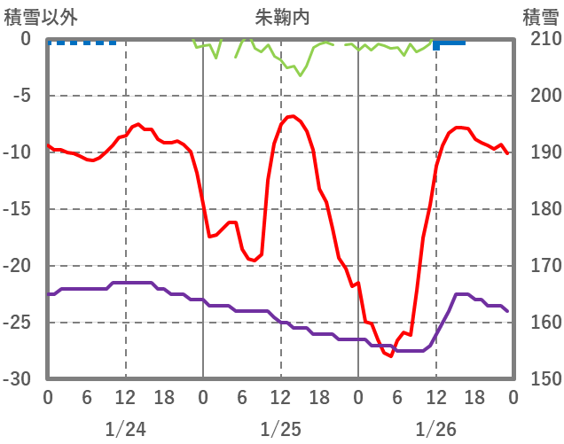 | 日 | 時 | 気温 | 降水 | 風向/風速 | 日照 | 積雪 | 降雪 |