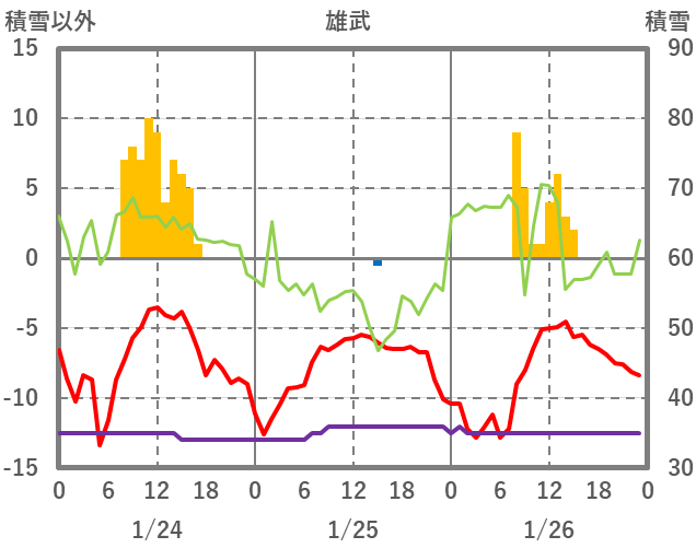 | 日 | 時 | 気温 | 降水 | 風向/風速 | 日照 | 積雪 | 降雪 |