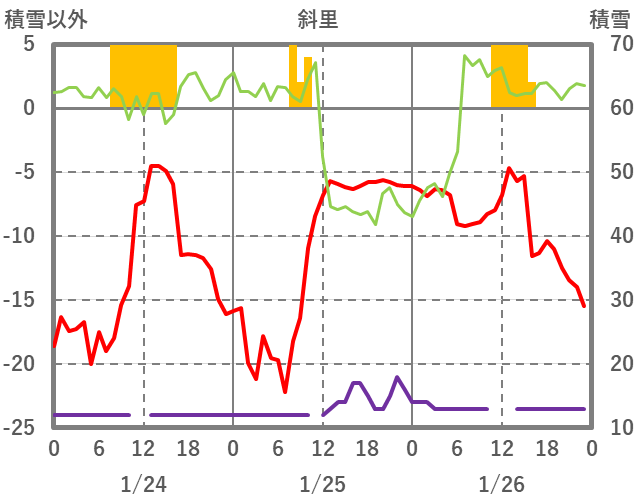 | 日 | 時 | 気温 | 降水 | 風向/風速 | 日照 | 積雪 | 降雪 |