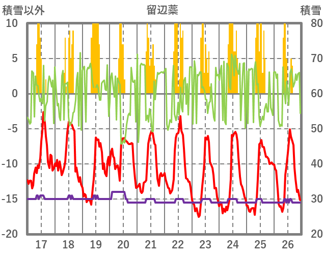 | 日 | 時 | 気温 | 降水 | 風向/風速 | 日照 | 積雪 | 降雪 |