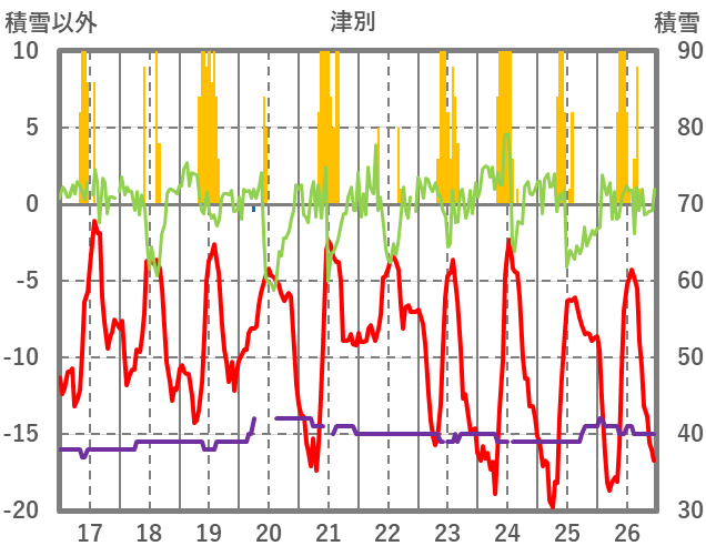 | 日 | 時 | 気温 | 降水 | 風向/風速 | 日照 | 積雪 | 降雪 |