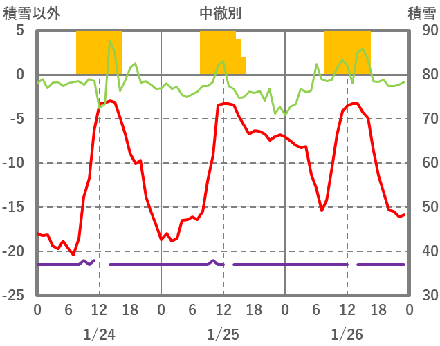 | 日 | 時 | 気温 | 降水 | 風向/風速 | 日照 | 積雪 | 降雪 |
