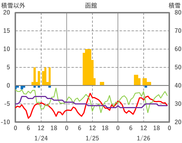 | 日 | 時 | 気温 | 降水 | 風向/風速 | 日照 | 積雪 | 降雪 |