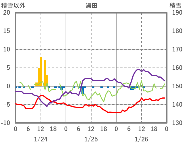 | 日 | 時 | 気温 | 降水 | 風向/風速 | 日照 | 積雪 | 降雪 |