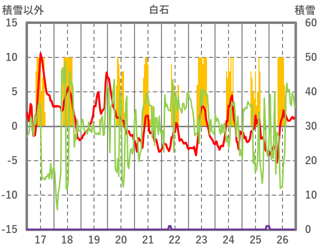 | 日 | 時 | 気温 | 降水 | 風向/風速 | 日照 | 積雪 | 降雪 |
