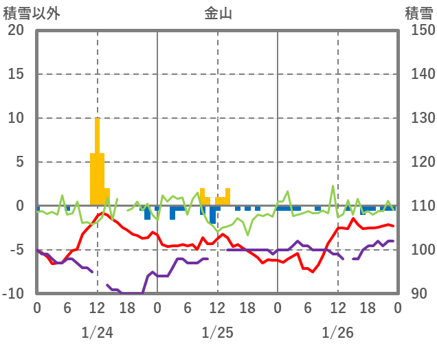 | 日 | 時 | 気温 | 降水 | 風向/風速 | 日照 | 積雪 | 降雪 |