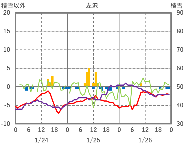 | 日 | 時 | 気温 | 降水 | 風向/風速 | 日照 | 積雪 | 降雪 |