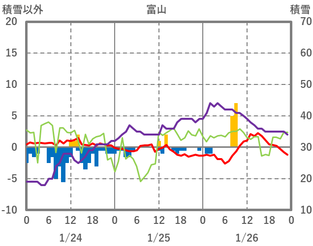 | 日 | 時 | 気温 | 降水 | 風向/風速 | 日照 | 積雪 | 降雪 |