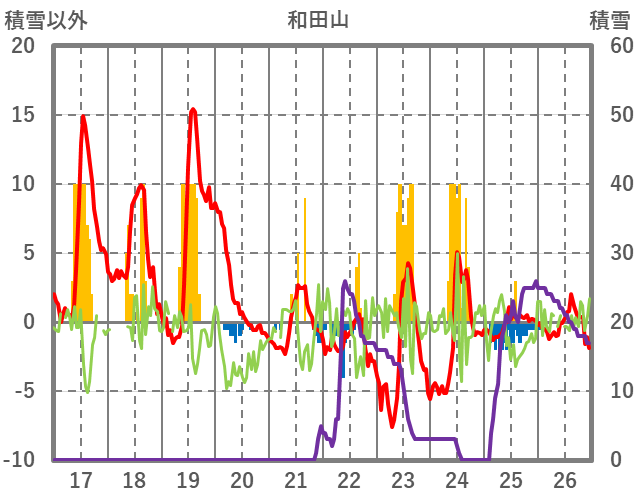 | 日 | 時 | 気温 | 降水 | 風向/風速 | 日照 | 積雪 | 降雪 |