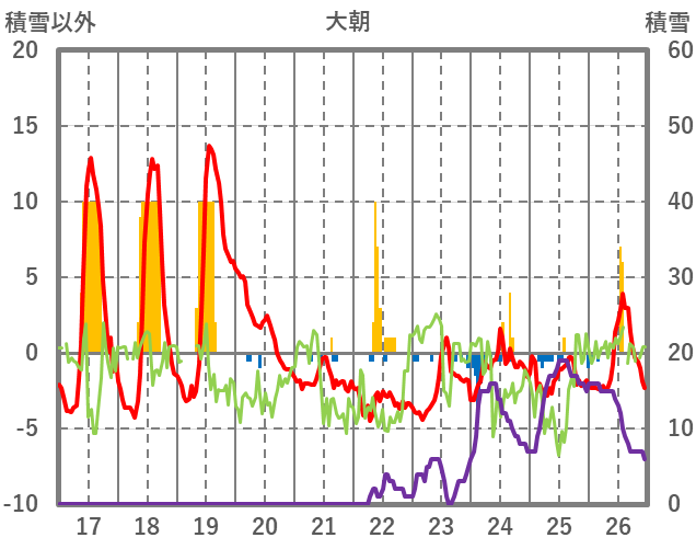 | 日 | 時 | 気温 | 降水 | 風向/風速 | 日照 | 積雪 | 降雪 |
