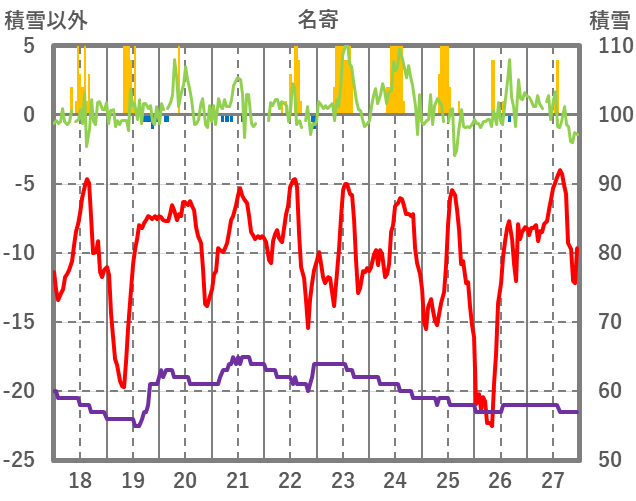| 日 | 時 | 気温 | 降水 | 風向/風速 | 日照 | 積雪 | 降雪 |