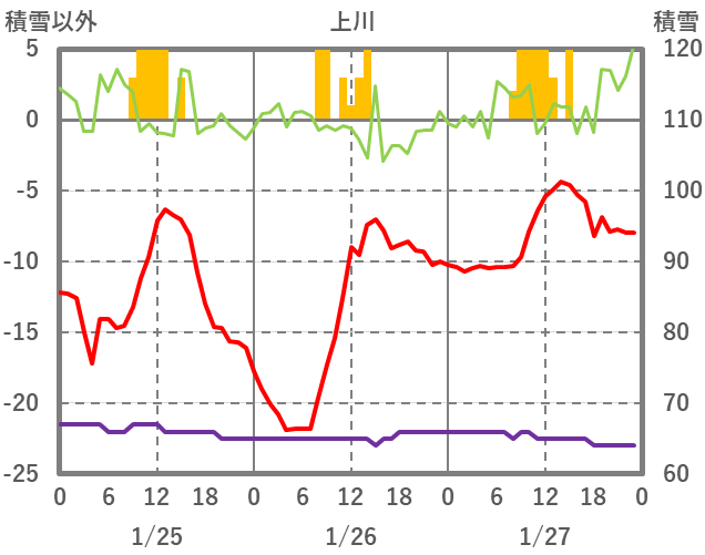 | 日 | 時 | 気温 | 降水 | 風向/風速 | 日照 | 積雪 | 降雪 |