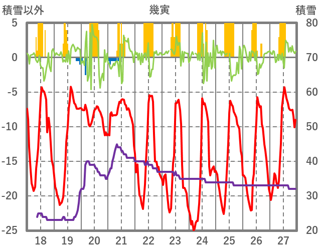 | 日 | 時 | 気温 | 降水 | 風向/風速 | 日照 | 積雪 | 降雪 |