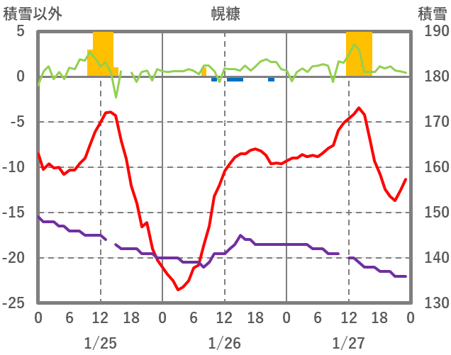 | 日 | 時 | 気温 | 降水 | 風向/風速 | 日照 | 積雪 | 降雪 |