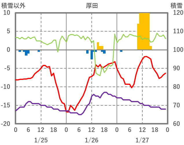 | 日 | 時 | 気温 | 降水 | 風向/風速 | 日照 | 積雪 | 降雪 |