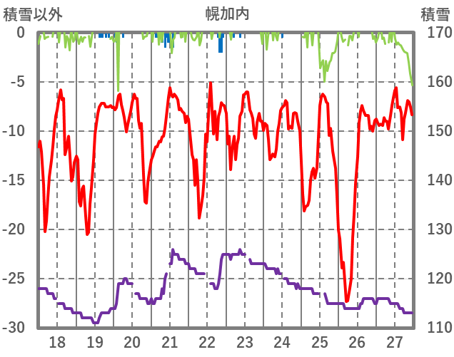| 日 | 時 | 気温 | 降水 | 風向/風速 | 日照 | 積雪 | 降雪 |
