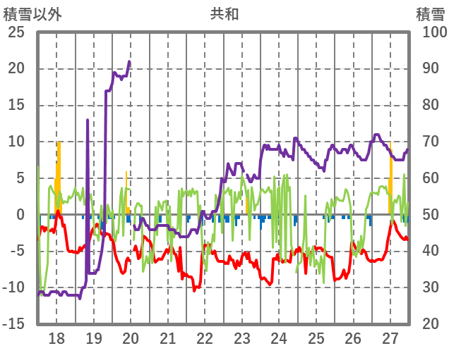 | 日 | 時 | 気温 | 降水 | 風向/風速 | 日照 | 積雪 | 降雪 |