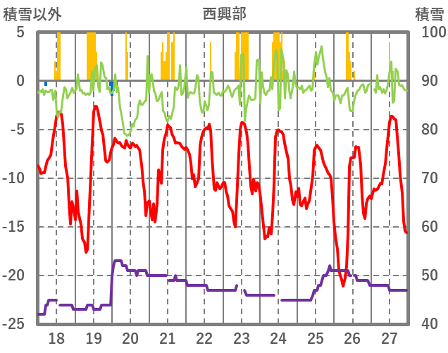 | 日 | 時 | 気温 | 降水 | 風向/風速 | 日照 | 積雪 | 降雪 |