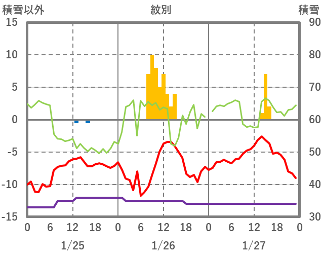 | 日 | 時 | 気温 | 降水 | 風向/風速 | 日照 | 積雪 | 降雪 |