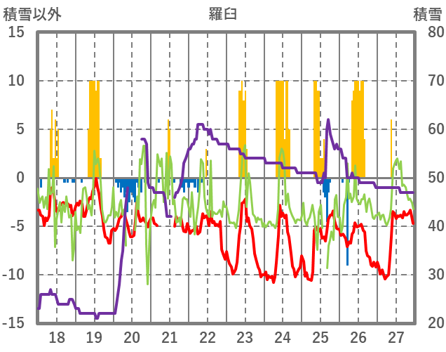 | 日 | 時 | 気温 | 降水 | 風向/風速 | 日照 | 積雪 | 降雪 |