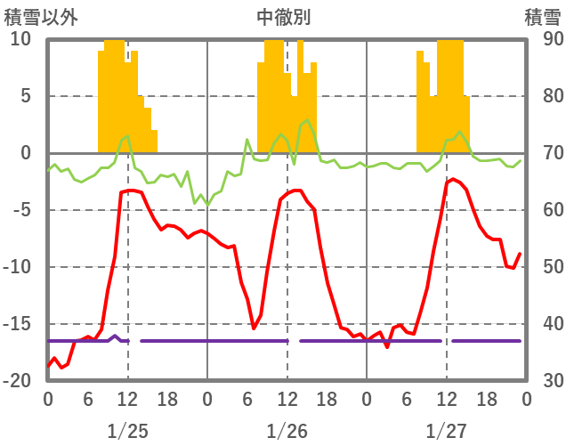 | 日 | 時 | 気温 | 降水 | 風向/風速 | 日照 | 積雪 | 降雪 |