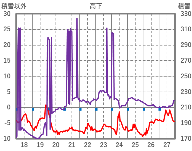 | 日 | 時 | 気温 | 降水 | 風向/風速 | 日照 | 積雪 | 降雪 |