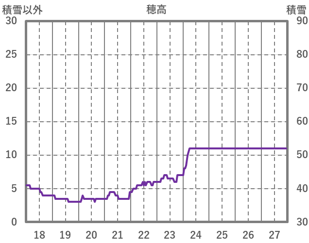 | 日 | 時 | 気温 | 降水 | 風向/風速 | 日照 | 積雪 | 降雪 |