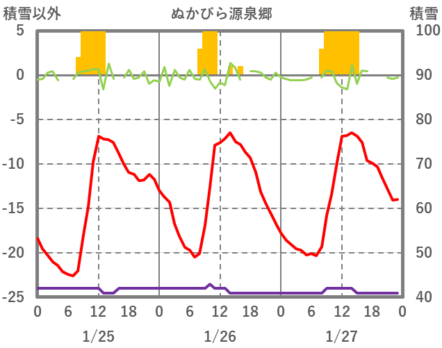 | 日 | 時 | 気温 | 降水 | 風向/風速 | 日照 | 積雪 | 降雪 |