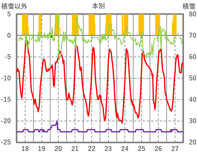 | 日 | 時 | 気温 | 降水 | 風向/風速 | 日照 | 積雪 | 降雪 |