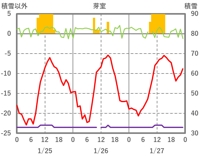 | 日 | 時 | 気温 | 降水 | 風向/風速 | 日照 | 積雪 | 降雪 |