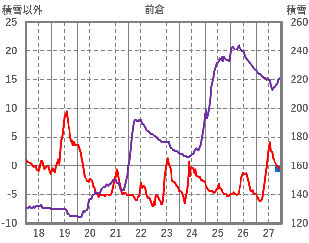 | 日 | 時 | 気温 | 降水 | 風向/風速 | 日照 | 積雪 | 降雪 |