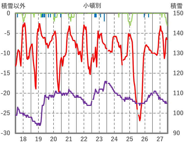 | 日 | 時 | 気温 | 降水 | 風向/風速 | 日照 | 積雪 | 降雪 |