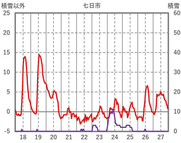 | 日 | 時 | 気温 | 降水 | 風向/風速 | 日照 | 積雪 | 降雪 |