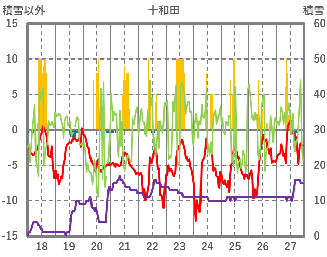 | 日 | 時 | 気温 | 降水 | 風向/風速 | 日照 | 積雪 | 降雪 |