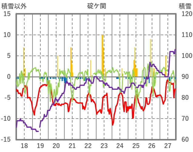 | 日 | 時 | 気温 | 降水 | 風向/風速 | 日照 | 積雪 | 降雪 |