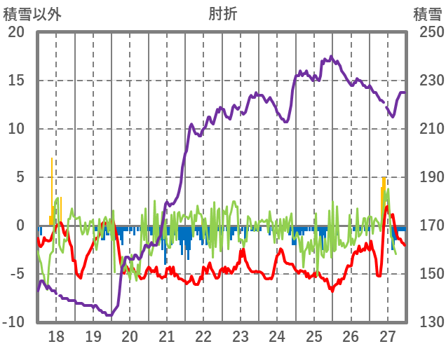 | 日 | 時 | 気温 | 降水 | 風向/風速 | 日照 | 積雪 | 降雪 |