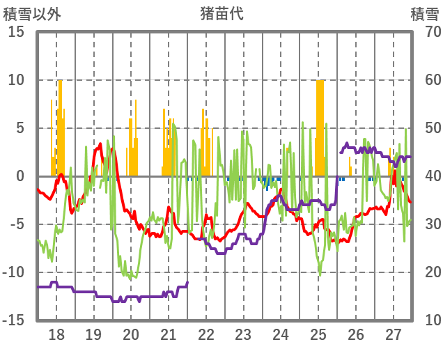 | 日 | 時 | 気温 | 降水 | 風向/風速 | 日照 | 積雪 | 降雪 |