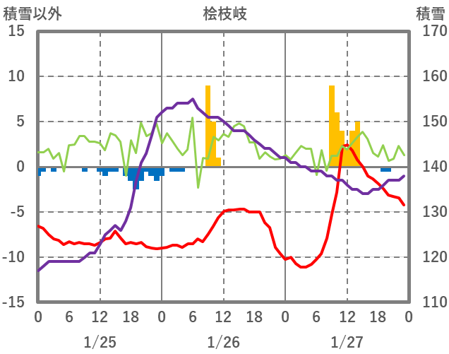 | 日 | 時 | 気温 | 降水 | 風向/風速 | 日照 | 積雪 | 降雪 |