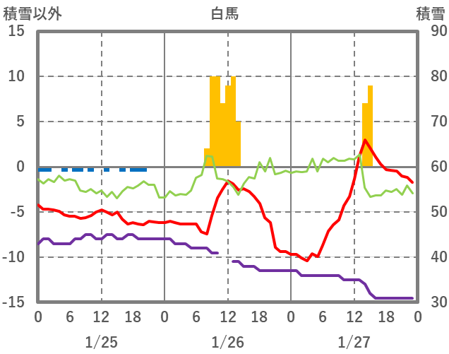 | 日 | 時 | 気温 | 降水 | 風向/風速 | 日照 | 積雪 | 降雪 |