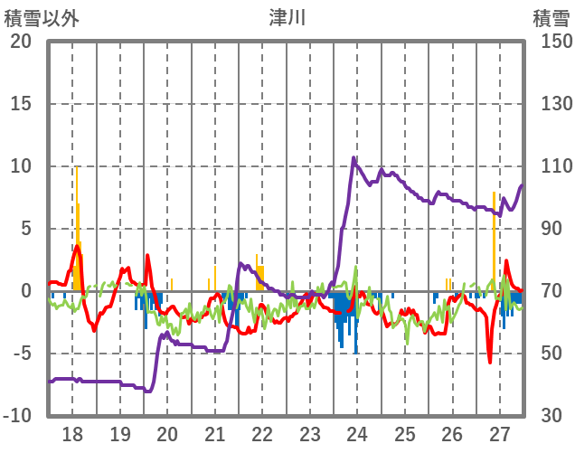 | 日 | 時 | 気温 | 降水 | 風向/風速 | 日照 | 積雪 | 降雪 |