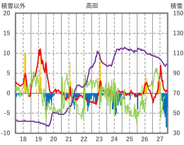 | 日 | 時 | 気温 | 降水 | 風向/風速 | 日照 | 積雪 | 降雪 |