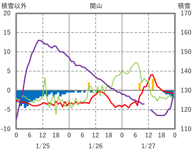| 日 | 時 | 気温 | 降水 | 風向/風速 | 日照 | 積雪 | 降雪 |