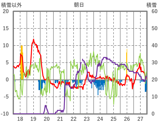 | 日 | 時 | 気温 | 降水 | 風向/風速 | 日照 | 積雪 | 降雪 |