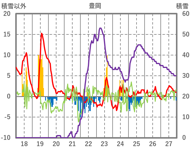 | 日 | 時 | 気温 | 降水 | 風向/風速 | 日照 | 積雪 | 降雪 |